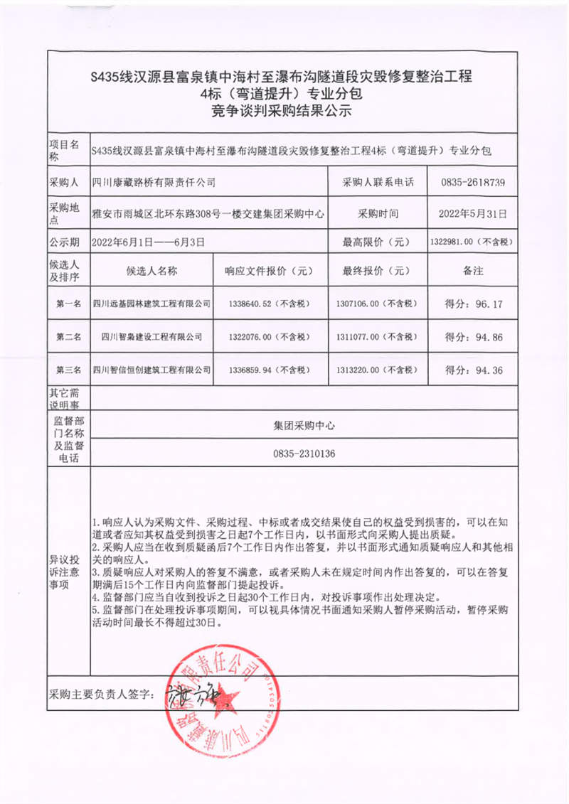 四川康藏路橋有限責(zé)任公司S435線漢源縣富泉鎮(zhèn)中海村至瀑布溝隧道段災(zāi)毀修復(fù)整治工程4標(biāo)(彎道提升)專業(yè)分包競(jìng)爭(zhēng)談判采購(gòu)結(jié)果公示