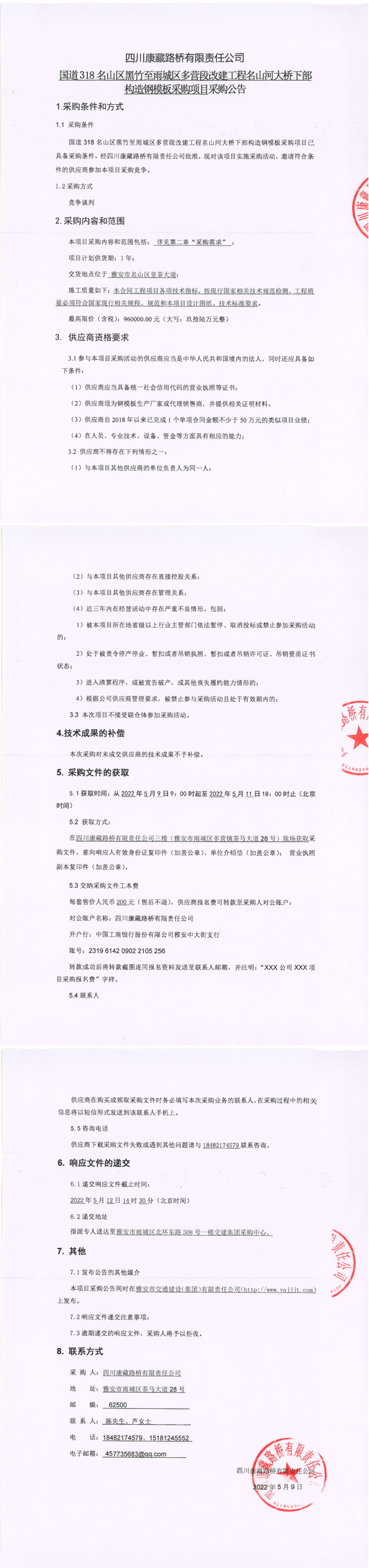 四川康藏路橋有限責任公司國道318名山區(qū)黑竹至雨城區(qū)多營段改建工程名山河大橋下部構(gòu)造鋼模塊采購項目采購公告
