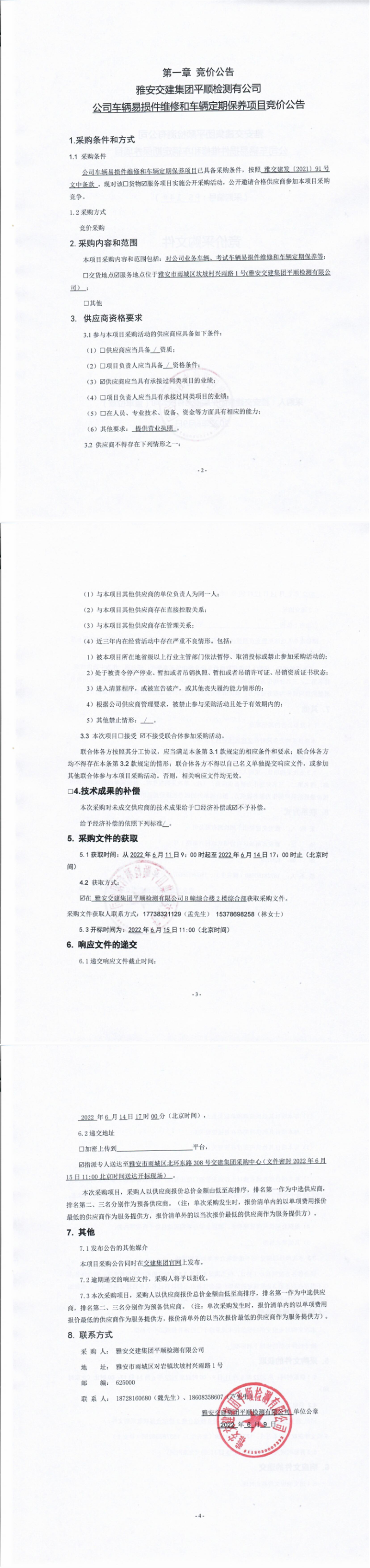 雅安交建集團(tuán)平順檢測有限公司公司車輛易損件維修和車輛定期保養(yǎng)項(xiàng)目競價(jià)公告