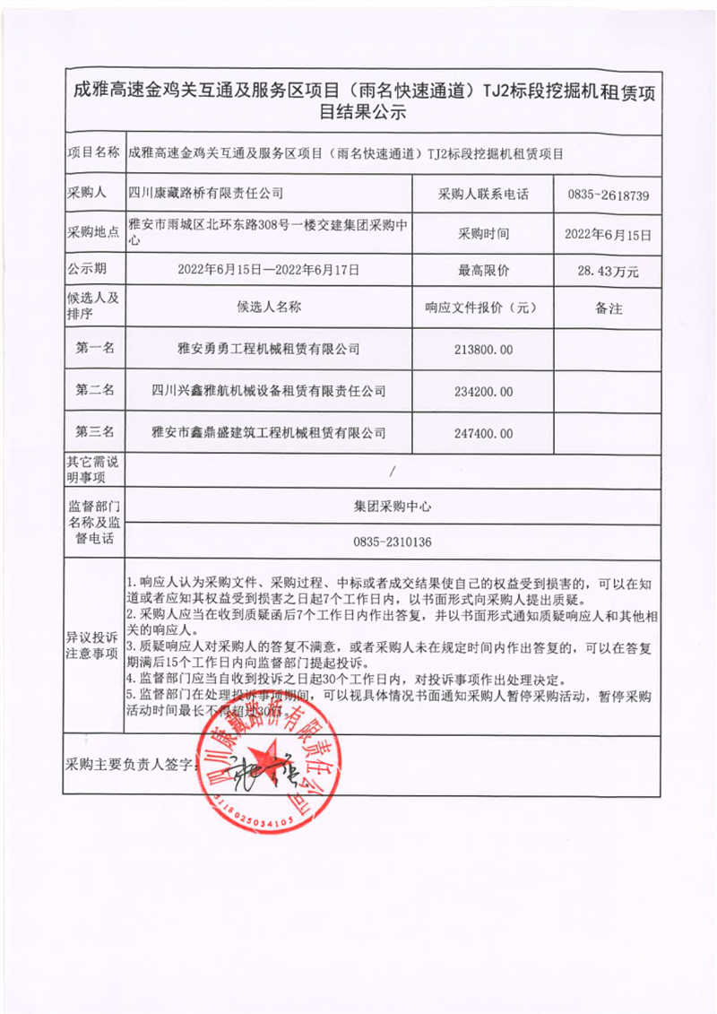 四川康藏路橋有限責(zé)任公司成雅高速金雞關(guān)互通及服務(wù)區(qū)項目(雨名快速通道)TJ2標(biāo)段挖掘機租賃項目結(jié)果公示