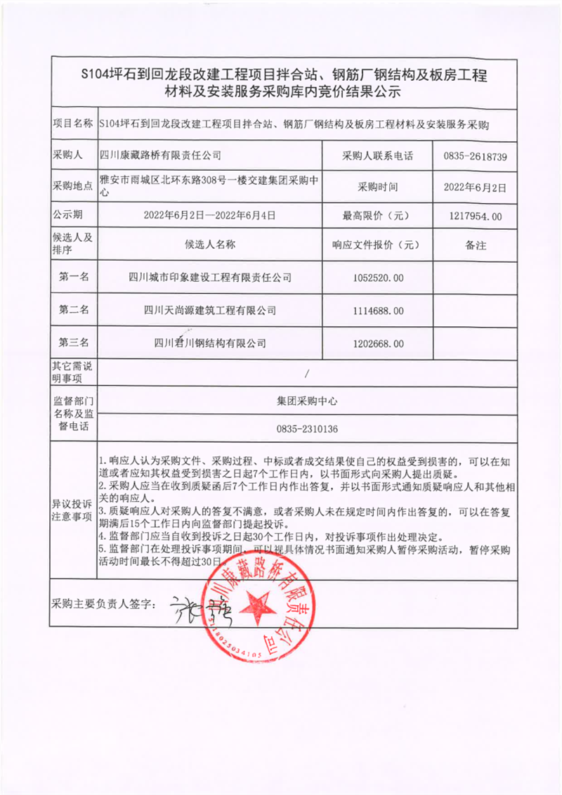 四川康藏路橋有限責(zé)任公司S104坪石到回龍段改建工程項目拌合站、鋼筋廠鋼結(jié)構(gòu)及板房工程材料及安裝服務(wù)庫內(nèi)競價結(jié)果公示
