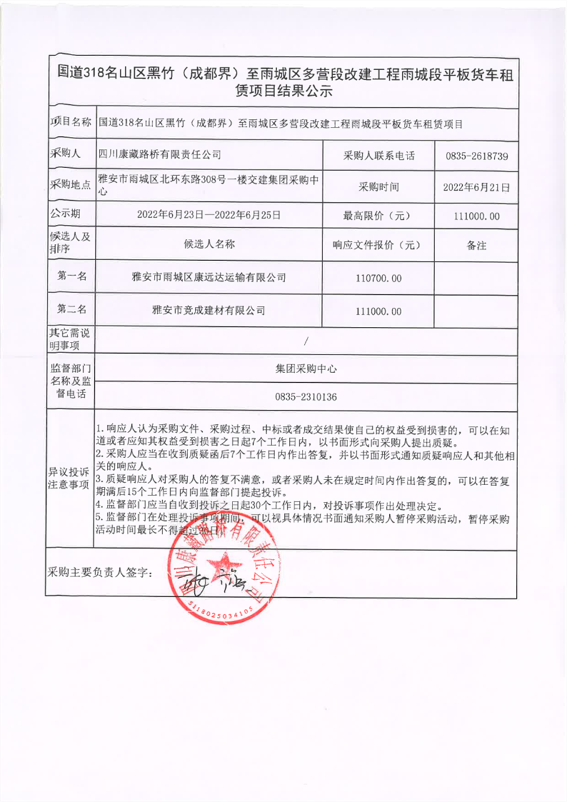四川康藏路橋有限責(zé)任公司國道318名山區(qū)黑竹(成都界)至雨城區(qū)多營段改建工程雨城段平板貨車租賃項(xiàng)目結(jié)果公示