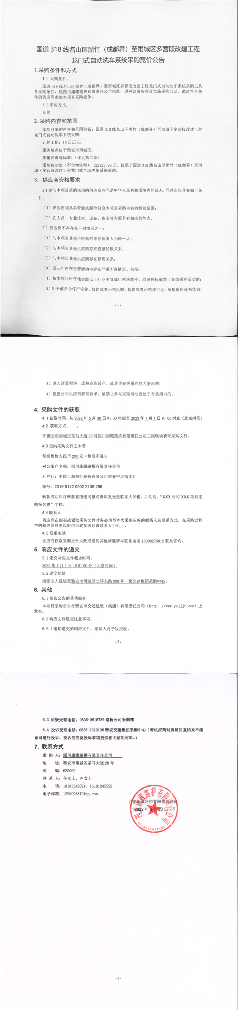 四川康藏路橋有限責任公司國道318名山區(qū)黑竹(成都界)至雨城區(qū)多營段改建工程龍門式自動洗車系統(tǒng)采購競價公告