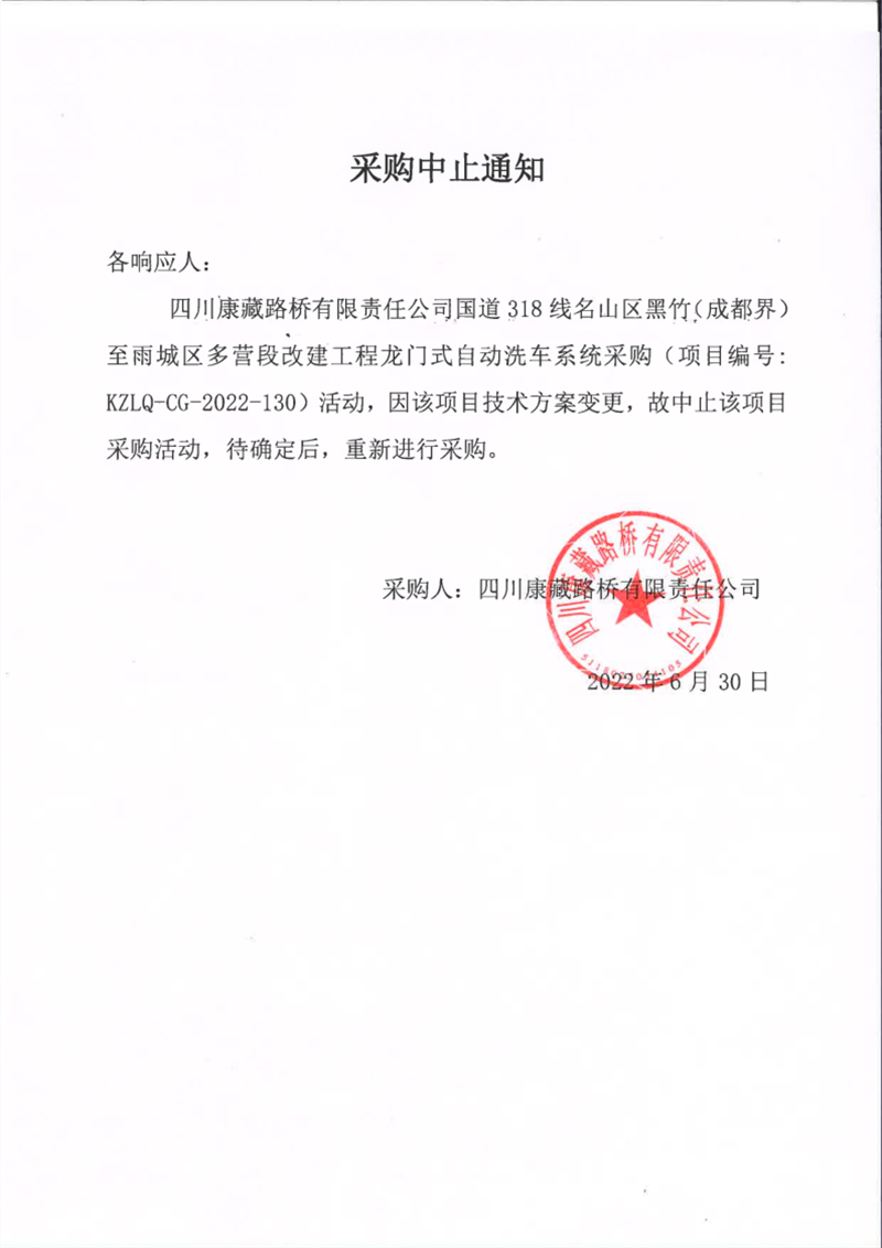 四川康藏路橋有限責任公司國道318線名山區(qū)黑竹(成都界)至雨城區(qū)多營段改建工程龍門式自動洗車系統(tǒng)采購中止通知
