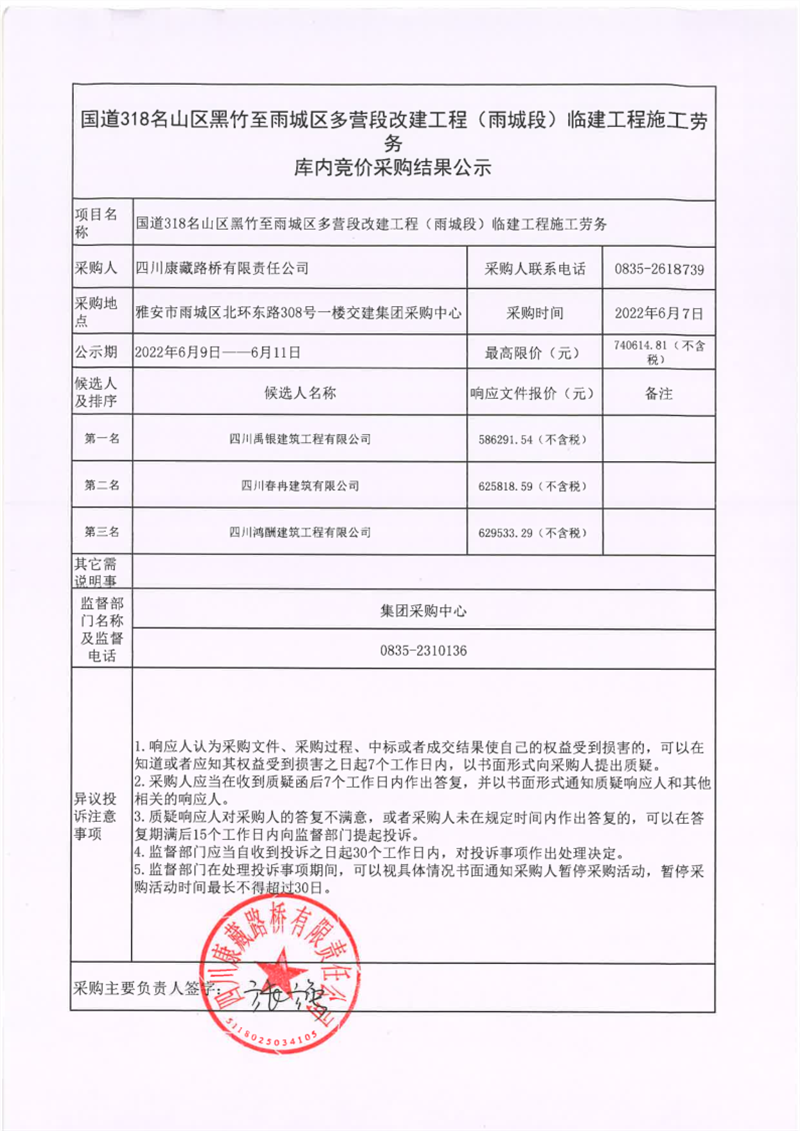 四川康藏路橋有限責(zé)任公司國(guó)道318名山區(qū)黑竹至雨城區(qū)多營(yíng)段改建工程(雨城段)臨建工程施工勞務(wù)庫(kù)內(nèi)競(jìng)價(jià)采購(gòu)結(jié)果公示