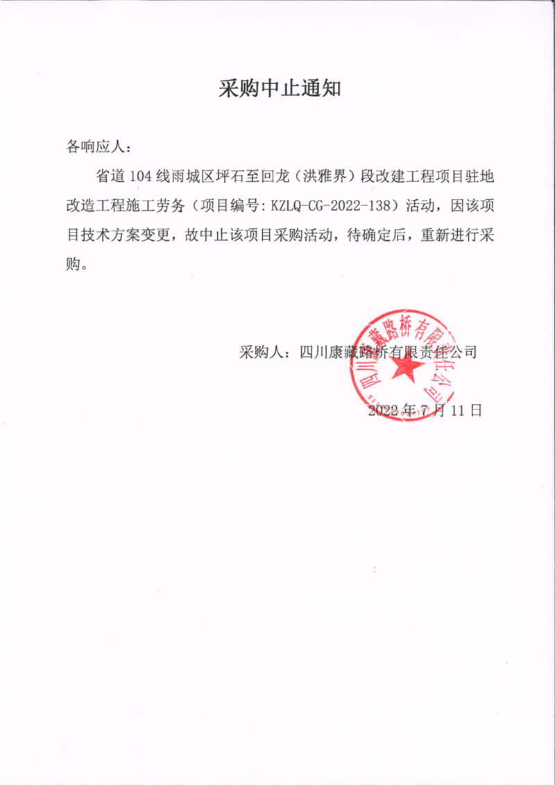 四川康藏路橋有限責(zé)任公司省道104線雨城區(qū)坪石至回龍(洪雅界)段改建工程項(xiàng)目駐地改造工程施工勞務(wù)采購中止通知