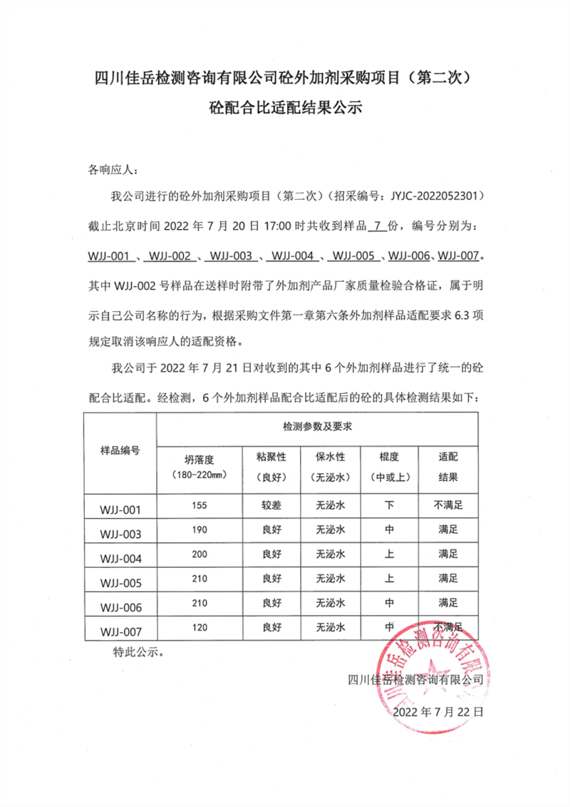四川佳岳檢測(cè)咨詢有限公司砼外加劑采購項(xiàng)目(第二次)砼配合比適配結(jié)果公示