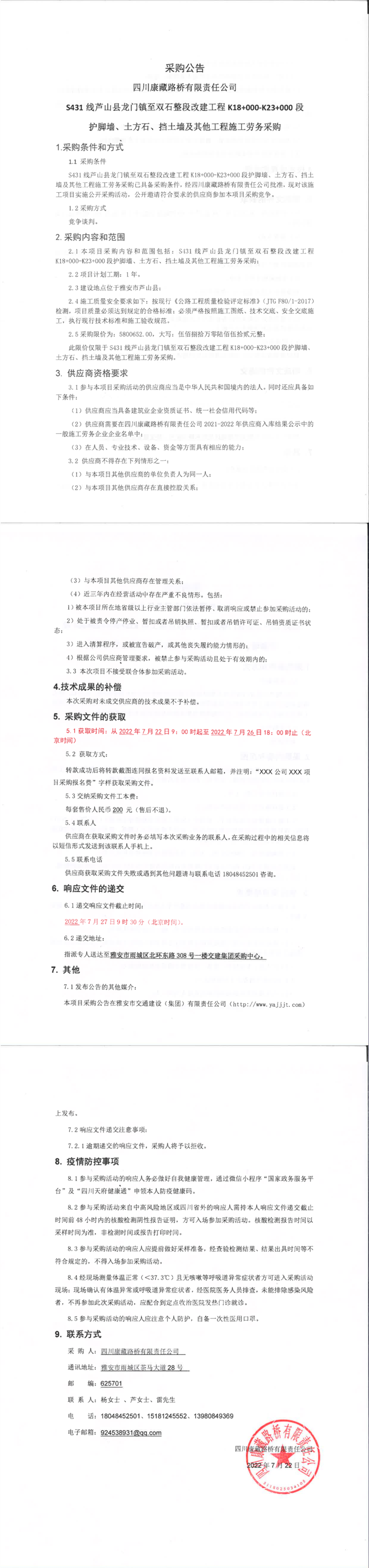 四川康藏路橋有限責(zé)任公司S431線(xiàn)蘆山縣龍門(mén)鎮(zhèn)至雙石整段改建工程K18+000-K23+000段護(hù)腳墻、土方石、擋土墻及其他工程施工勞務(wù)采購(gòu)