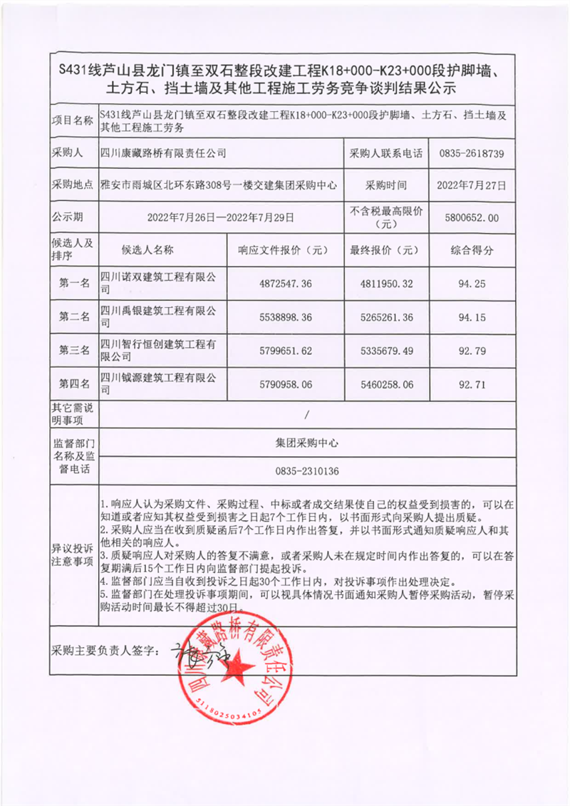 四川康藏路橋有限責(zé)任公司S431線蘆山縣龍門鎮(zhèn)至雙石整段改建工程K18+000-K23+000段護(hù)腳墻、土方石、擋土墻及其他工程施工勞務(wù)競(jìng)爭(zhēng)談判結(jié)果公示