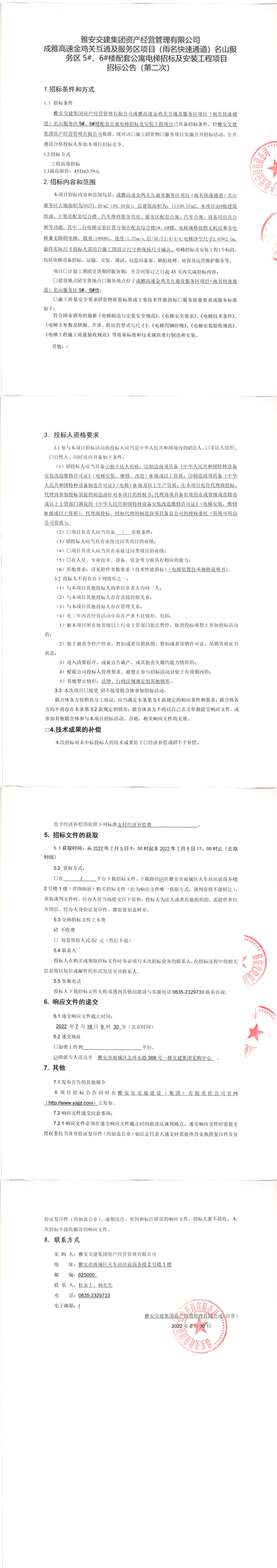 雅安交建集團資產(chǎn)經(jīng)營管理有限公司成雅高速金雞關互通及服務區(qū)項目(雨名快速通道)名山服務區(qū)5#、6#樓配套公寓電梯招標及安裝工程項目招標公告(第二次)