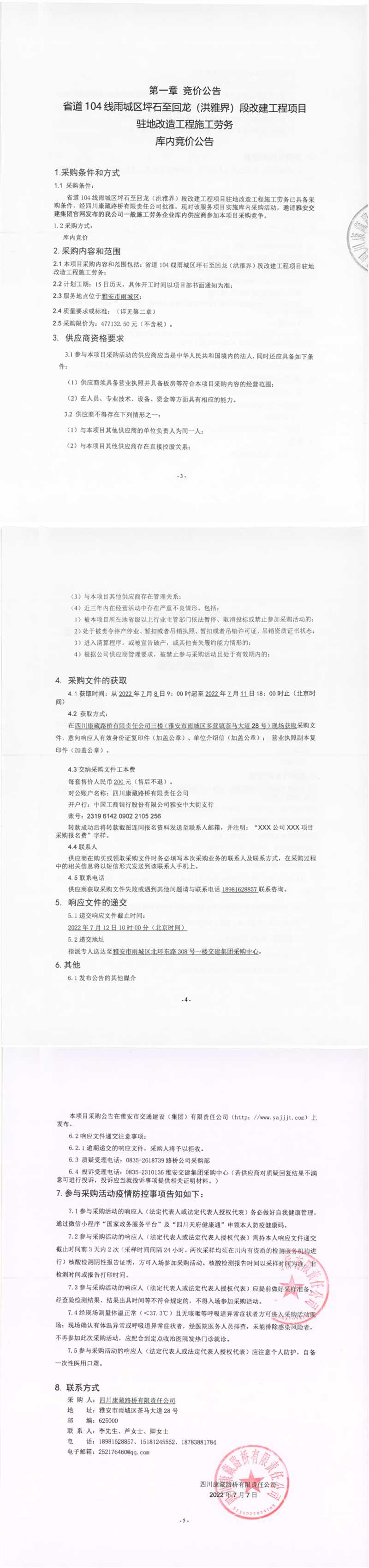四川康藏路橋有限責(zé)任公司省道104線雨城區(qū)坪石至回龍(洪雅界)段改建工程項(xiàng)目駐地改造工程施工勞務(wù)庫內(nèi)競價(jià)公告