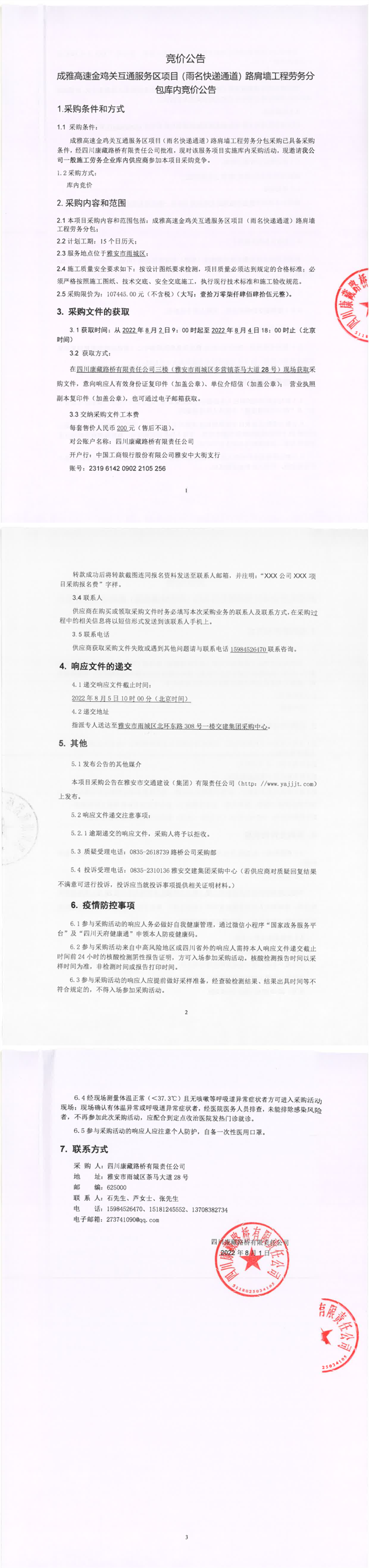 四川康藏路橋有限責(zé)任公司成雅高速金雞關(guān)互通服務(wù)區(qū)項(xiàng)目(雨名快速通道)路肩墻工程勞務(wù)分包庫(kù)內(nèi)競(jìng)價(jià)公告