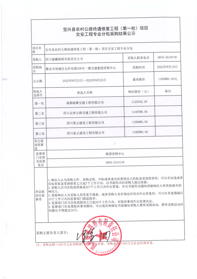 四川康藏路橋有限責(zé)任公司寶興縣農(nóng)村公路搶通修復(fù)工程(第一批)交安工程專業(yè)分包采購結(jié)果公示