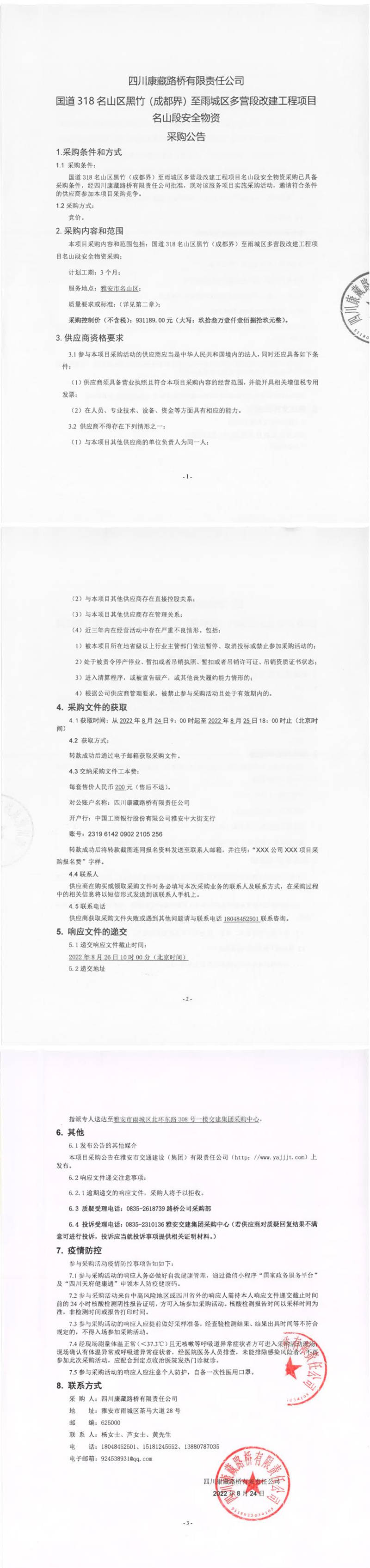 四川康藏路橋有限責(zé)任公司國道318名山區(qū)黑竹(成都界)至雨城區(qū)多營段改建工程項(xiàng)目名山段安全物資采購公告