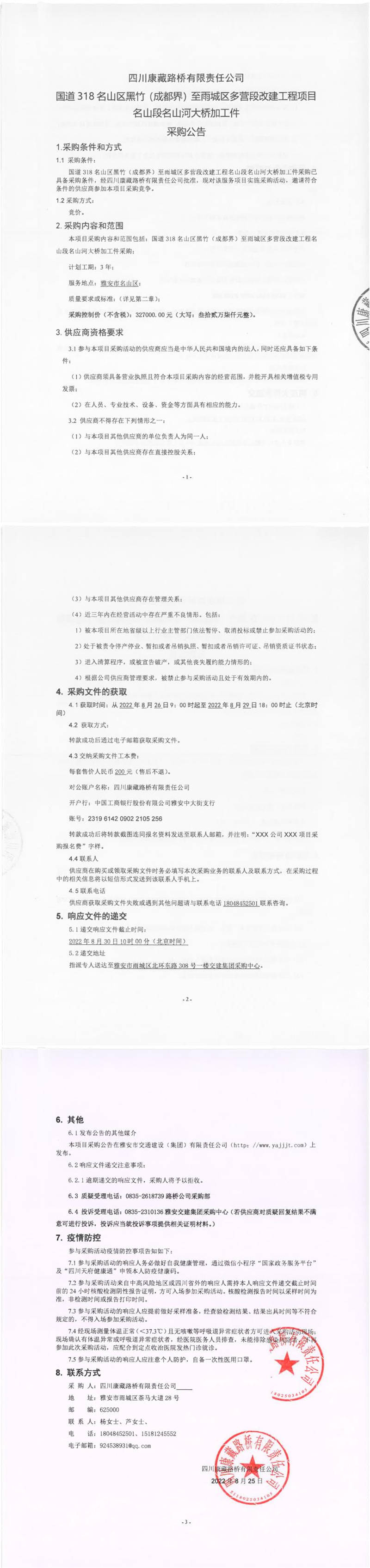 四川康藏路橋有限責(zé)任公司國道318名山區(qū)黑竹(成都界)至雨城區(qū)多營段改建工程項目名山段名山河大橋加工件采購公告