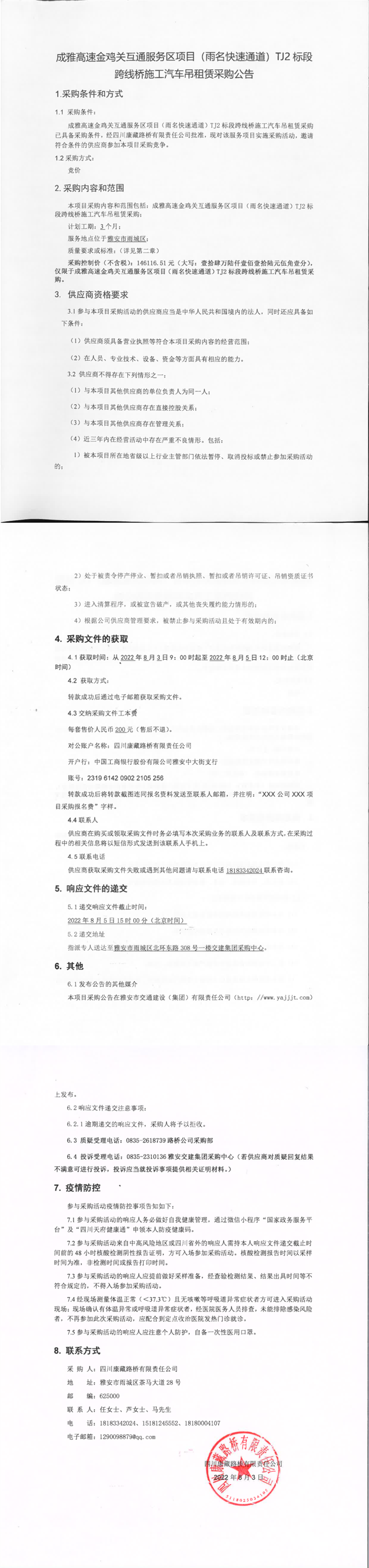四川康藏路橋有限責(zé)任公司成雅高速金雞關(guān)互通服務(wù)區(qū)項目(雨名快速通道)TJ2標(biāo)段跨線橋施工汽車吊租賃采購公告
