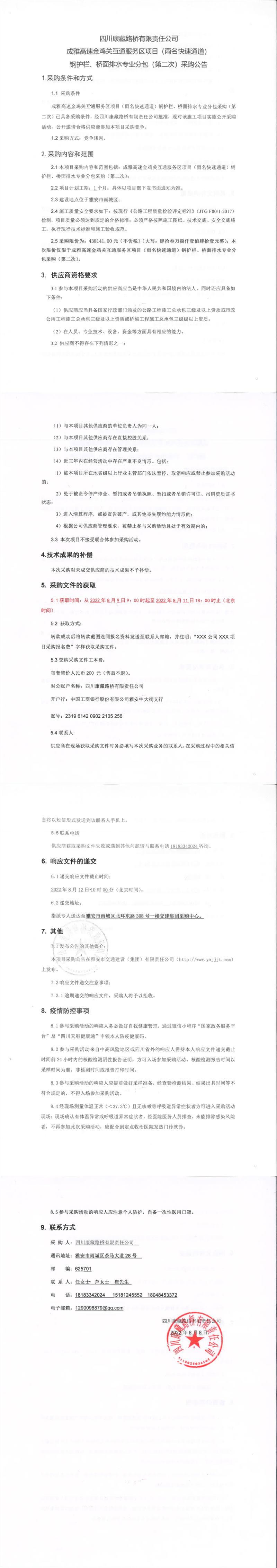 四川康藏路橋有限責(zé)任公司成雅高速金雞關(guān)互通服務(wù)區(qū)項(xiàng)目(雨名快速通道)鋼護(hù)欄、橋面排水工程專業(yè)分包(第二次)采購公告