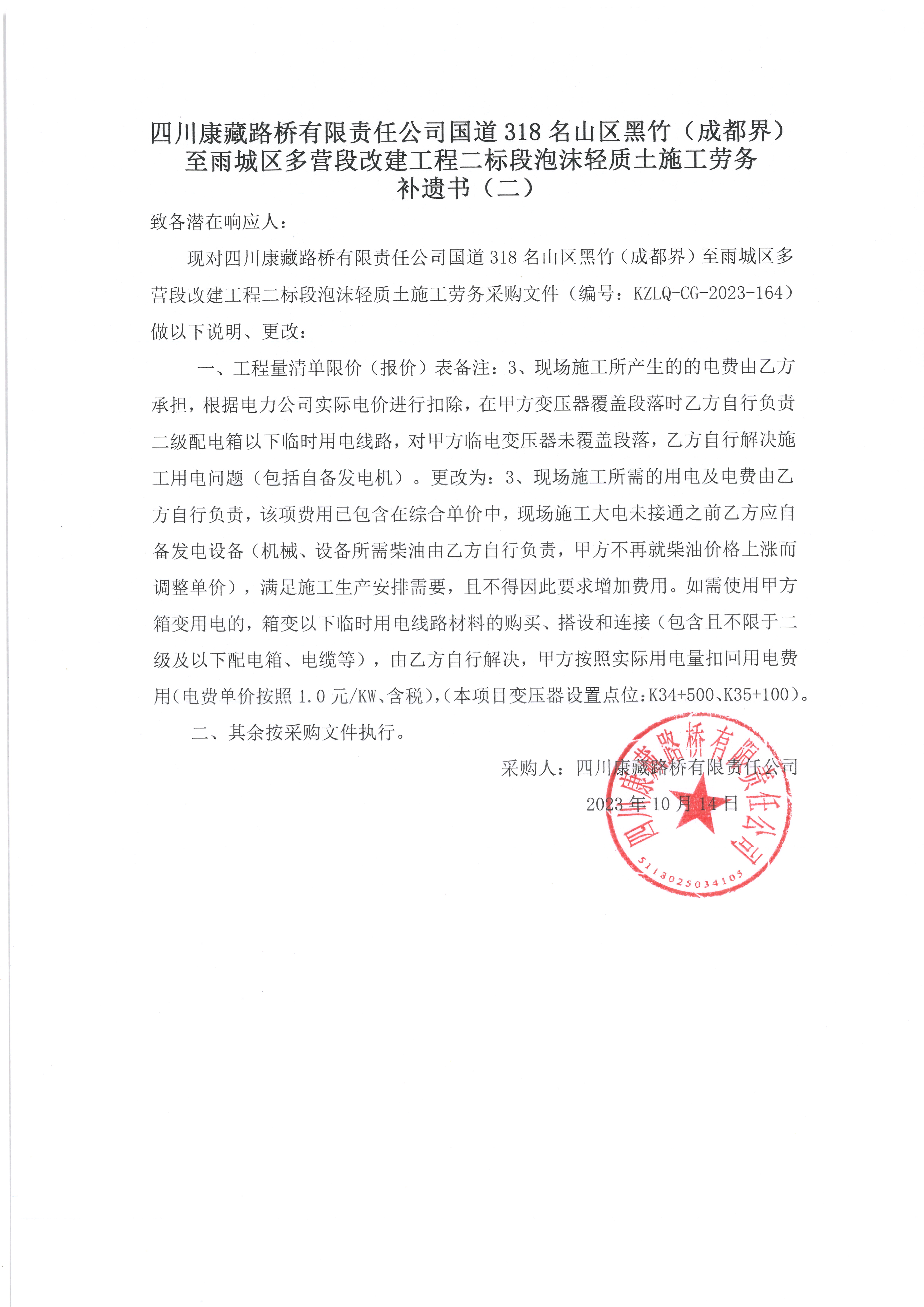 四川康藏路橋有限責任公司國道318名山區(qū)黑竹(成都界)至雨城區(qū)多營段改建工程二標段泡沫輕質(zhì)土施工勞務(wù) 補遺書(二)