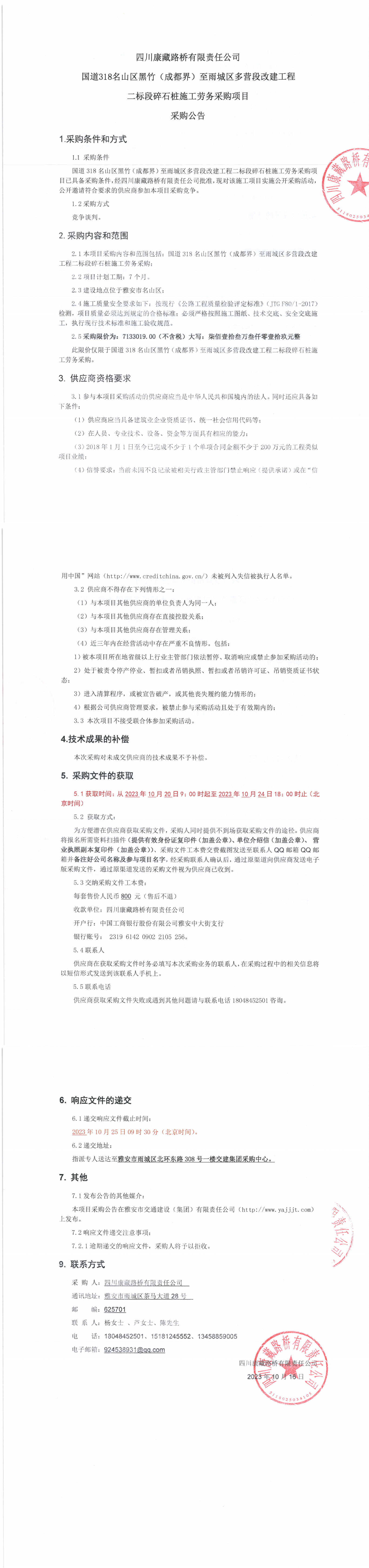 四川康藏路橋有限責(zé)任公司國(guó)道318名山區(qū)黑竹(成都界)至雨城區(qū)多營(yíng)段改建工程二標(biāo)段碎石樁施工勞務(wù)采購(gòu)項(xiàng)目采購(gòu)公告