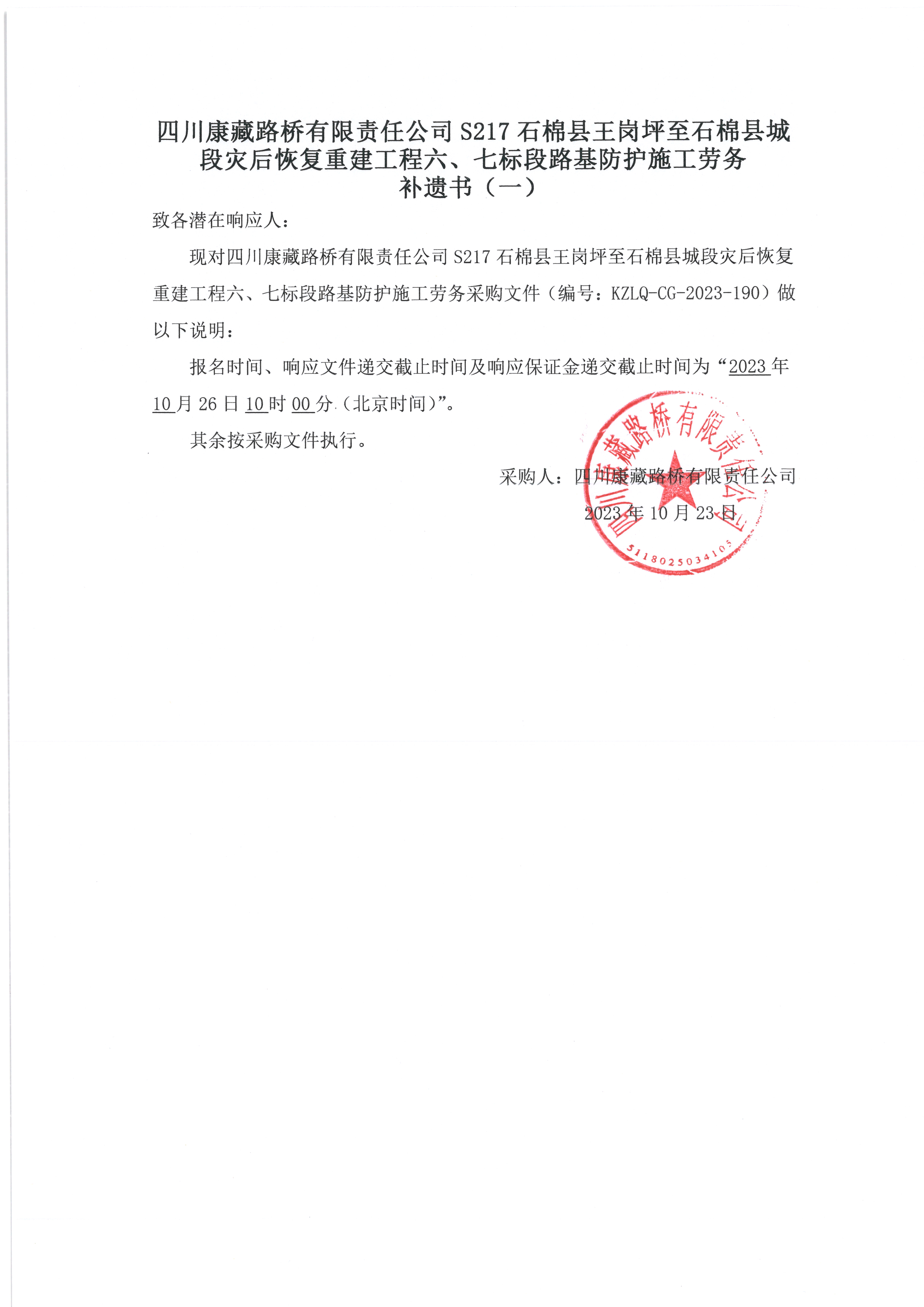 四川康藏路橋有限責(zé)任公司S217石棉縣王崗坪至石棉縣城段災(zāi)后恢復(fù)重建工程六、七標(biāo)段路基防護(hù)施工勞務(wù) 補(bǔ)遺書(shū)(一)