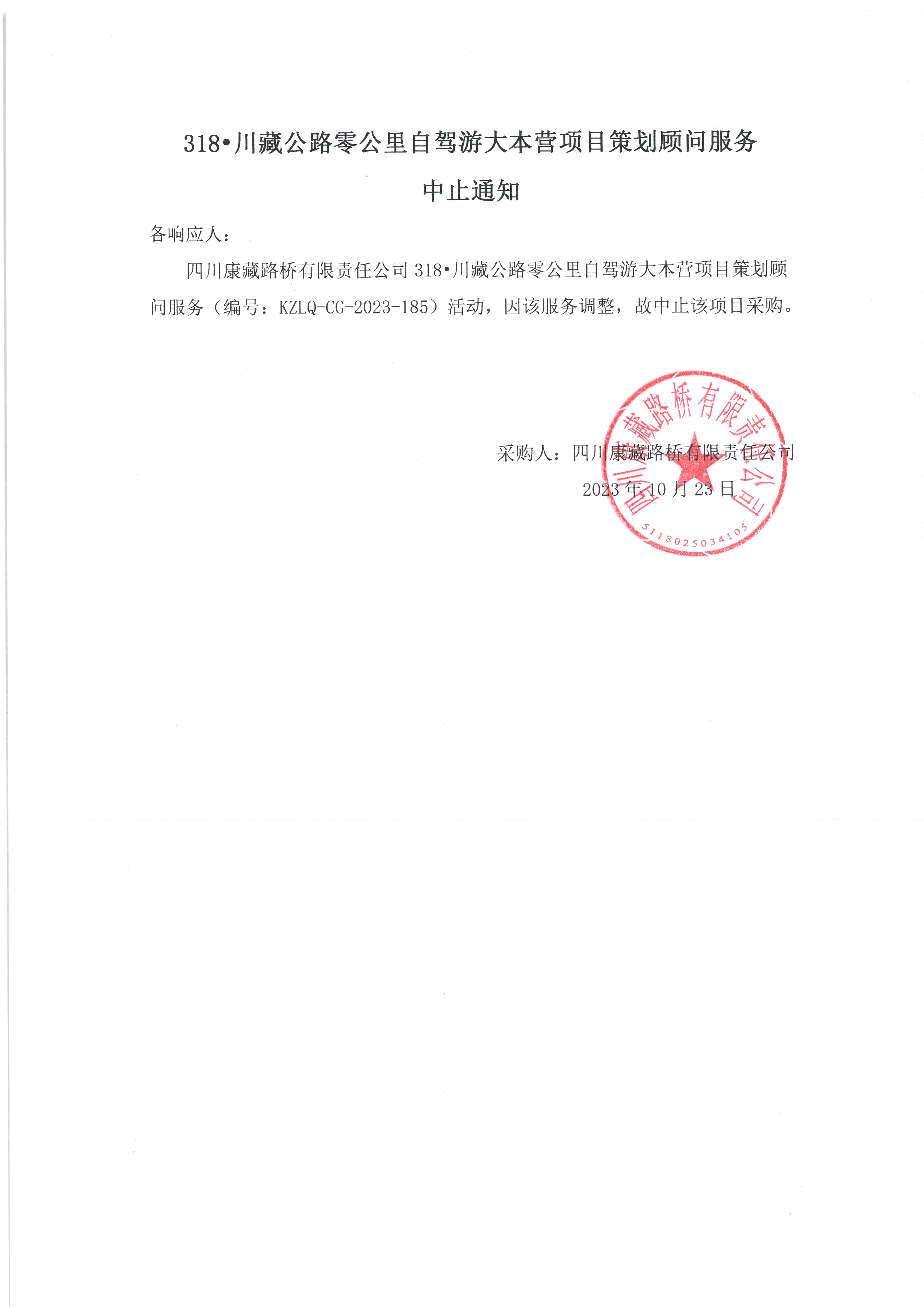 四川康藏路橋有限責(zé)任公司318•川藏公路零公里自駕游大本營項目策劃顧問服務(wù)中止通知