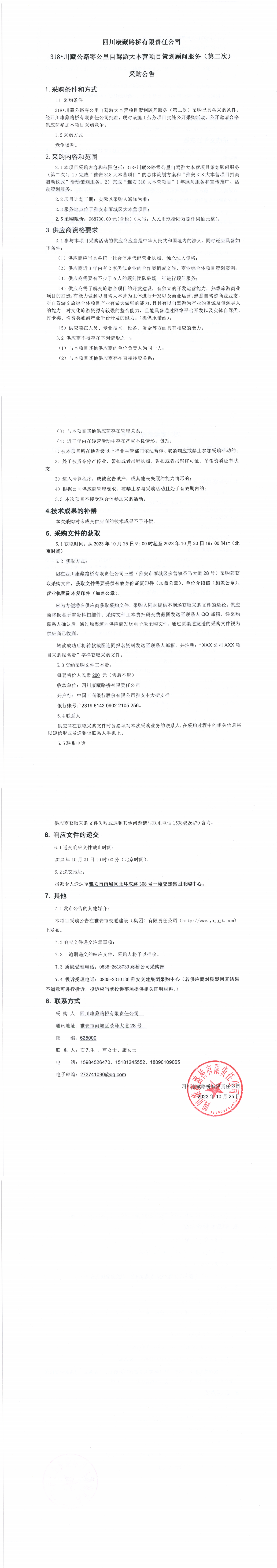 四川康藏路橋有限責(zé)任公司318•川藏公路零公里自駕游大本營(yíng)項(xiàng)目策劃顧問(wèn)服務(wù)(第二次)采購(gòu)公告