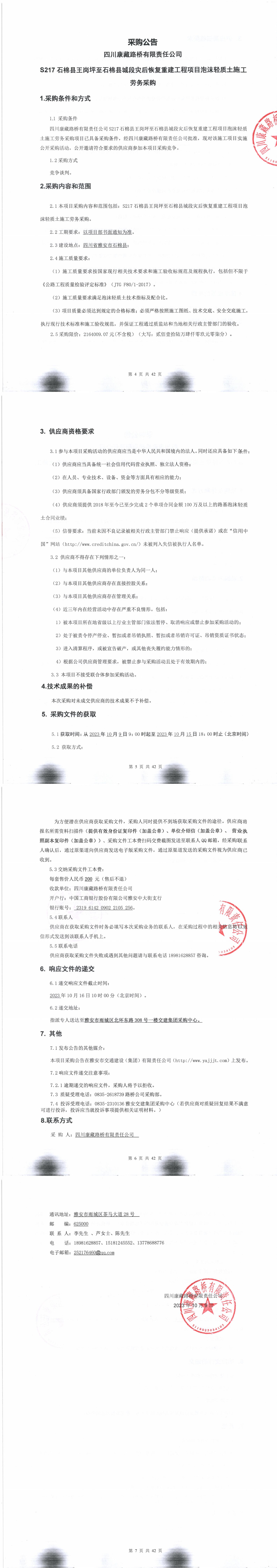 四川康藏路橋有限責任公司S217石棉縣王崗坪至石棉縣城段災后恢復重建工程項目泡沫輕質土施工勞務采購公告