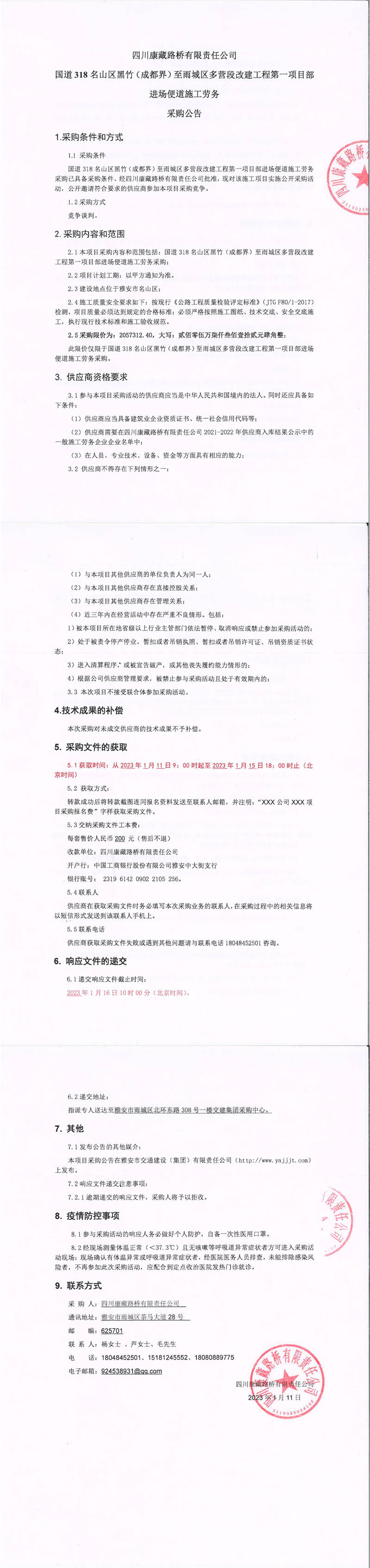 四川康藏路橋有限責(zé)任公司S431蘆山縣龍門至雙石段改建工程項目邊坡防護(hù)工程施工勞務(wù)采購競爭談判結(jié)果公示