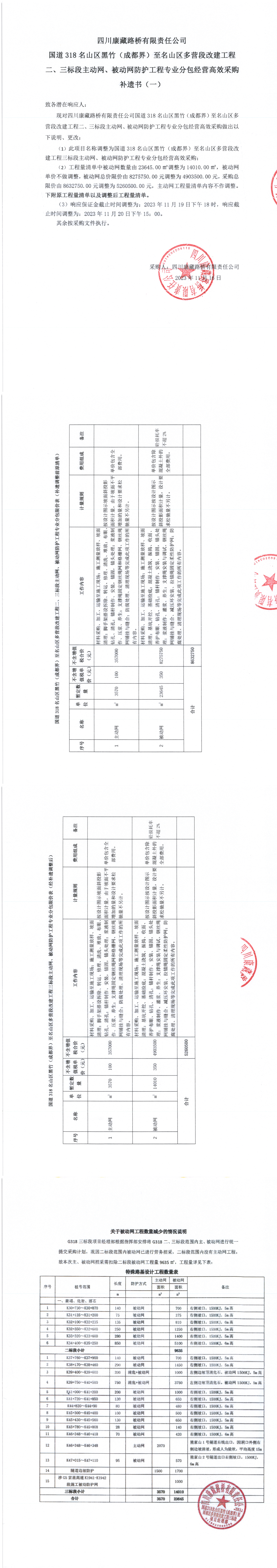 四川康藏路橋有限責(zé)任公司國道318名山區(qū)黑竹(成都界)至名山區(qū)多營段改建工程二、三標(biāo)段主動網(wǎng)、被動網(wǎng)防護(hù)工程專業(yè)分包經(jīng)營高效采購補(bǔ)遺書(一)