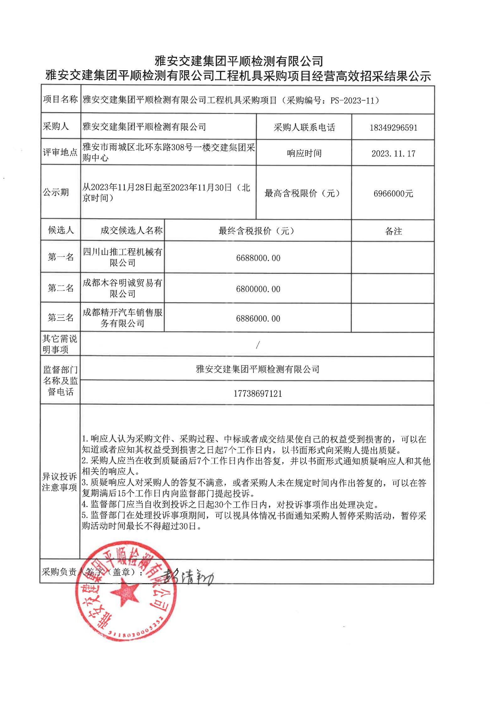 雅安交建集團平順檢測有限公司工程機具采購項目經營高效招采結果公示