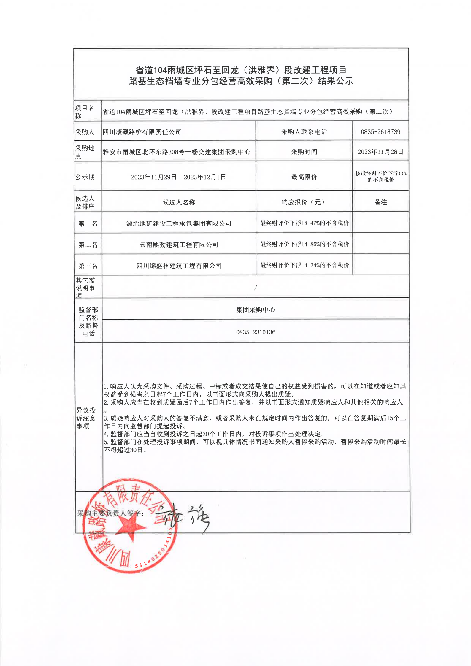 四川康藏路橋有限責(zé)任公司省道104雨城區(qū)坪石至回龍(洪雅界)段改建工程項目路基生態(tài)擋墻專業(yè)分包經(jīng)營高效采購(第二次)結(jié)果公示