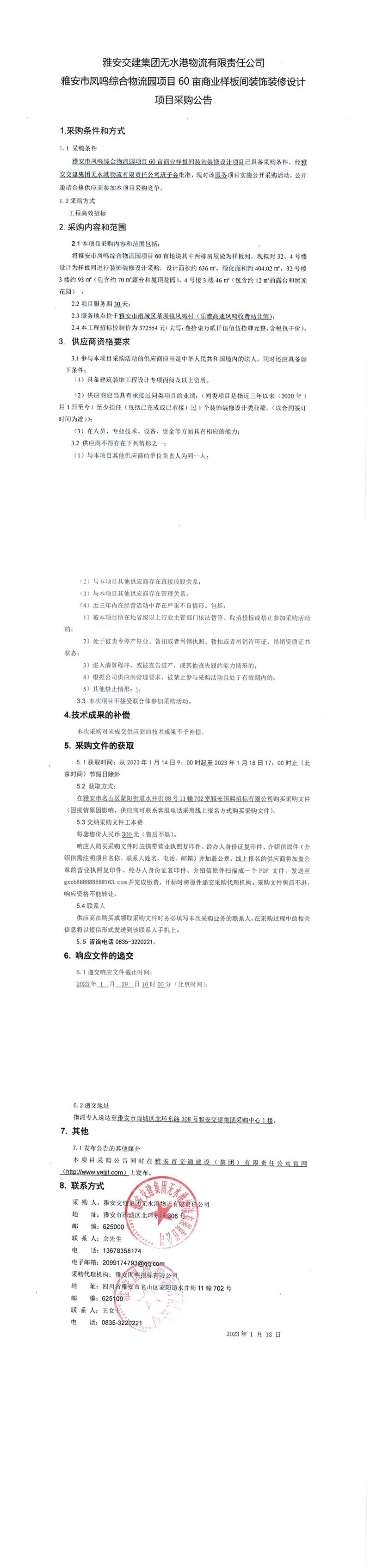 雅安交建集團無水港物流有限責任公司雅安市鳳鳴綜合物流園項目60畝商業(yè)樣板間裝飾裝修設計項目采購公告