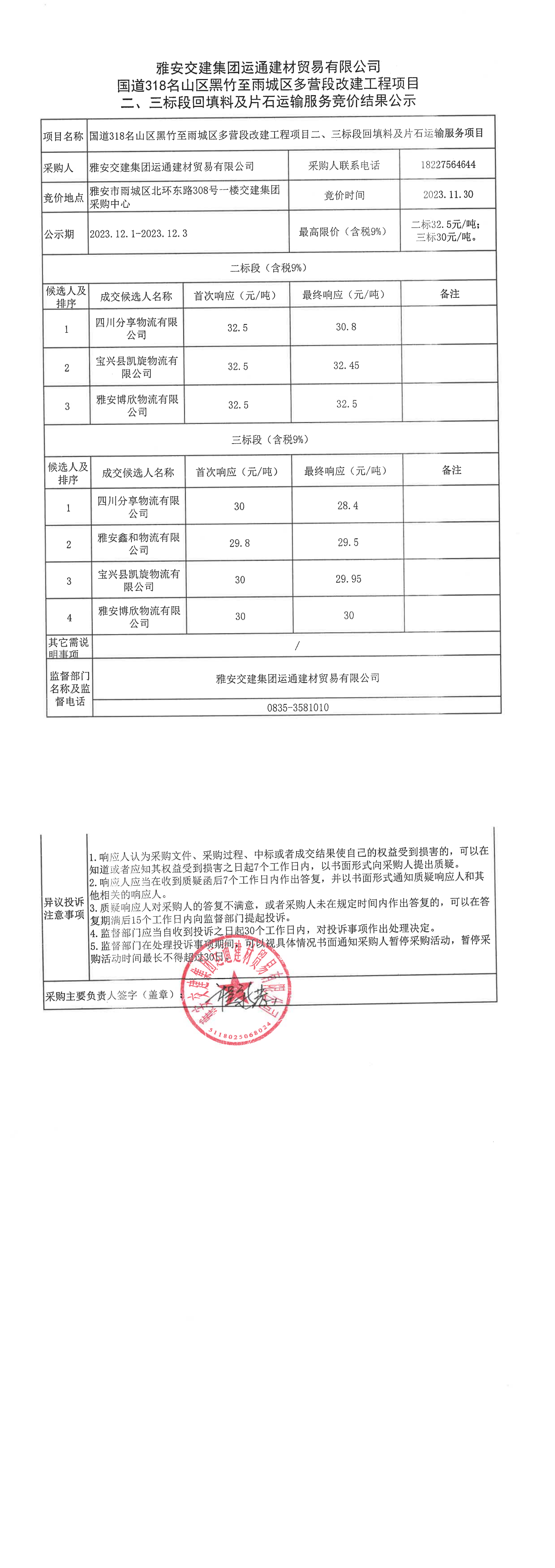雅安交建集團運通建材貿(mào)易有限公司國道318名山區(qū)黑竹至雨城區(qū)多營段改建工程項目二、三標段回填料、片石運輸服務(wù)競價結(jié)果公示