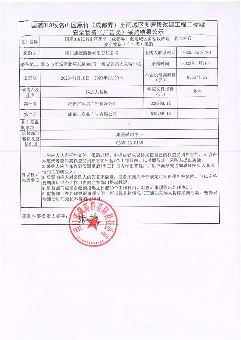 四川康藏路橋有限責任公司國道318線名山區(qū)黑竹(成都界)至雨城區(qū)多營段改建工程二標段安全物資(廣告類)采購結(jié)果公示