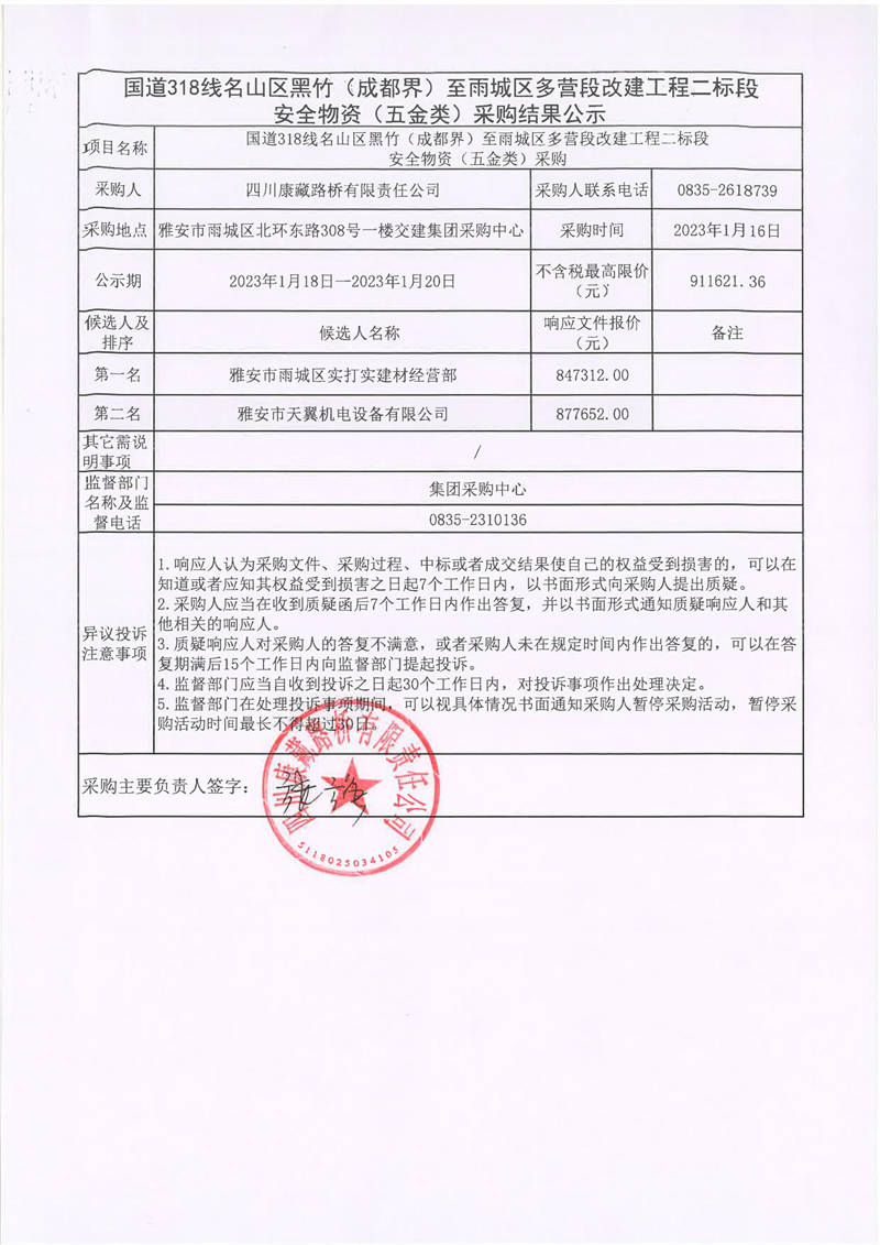 四川康藏路橋有限責任公司國道318線名山區(qū)黑竹(成都界)至雨城區(qū)多營段改建工程二標段安全物資(五金類)采購結果公示