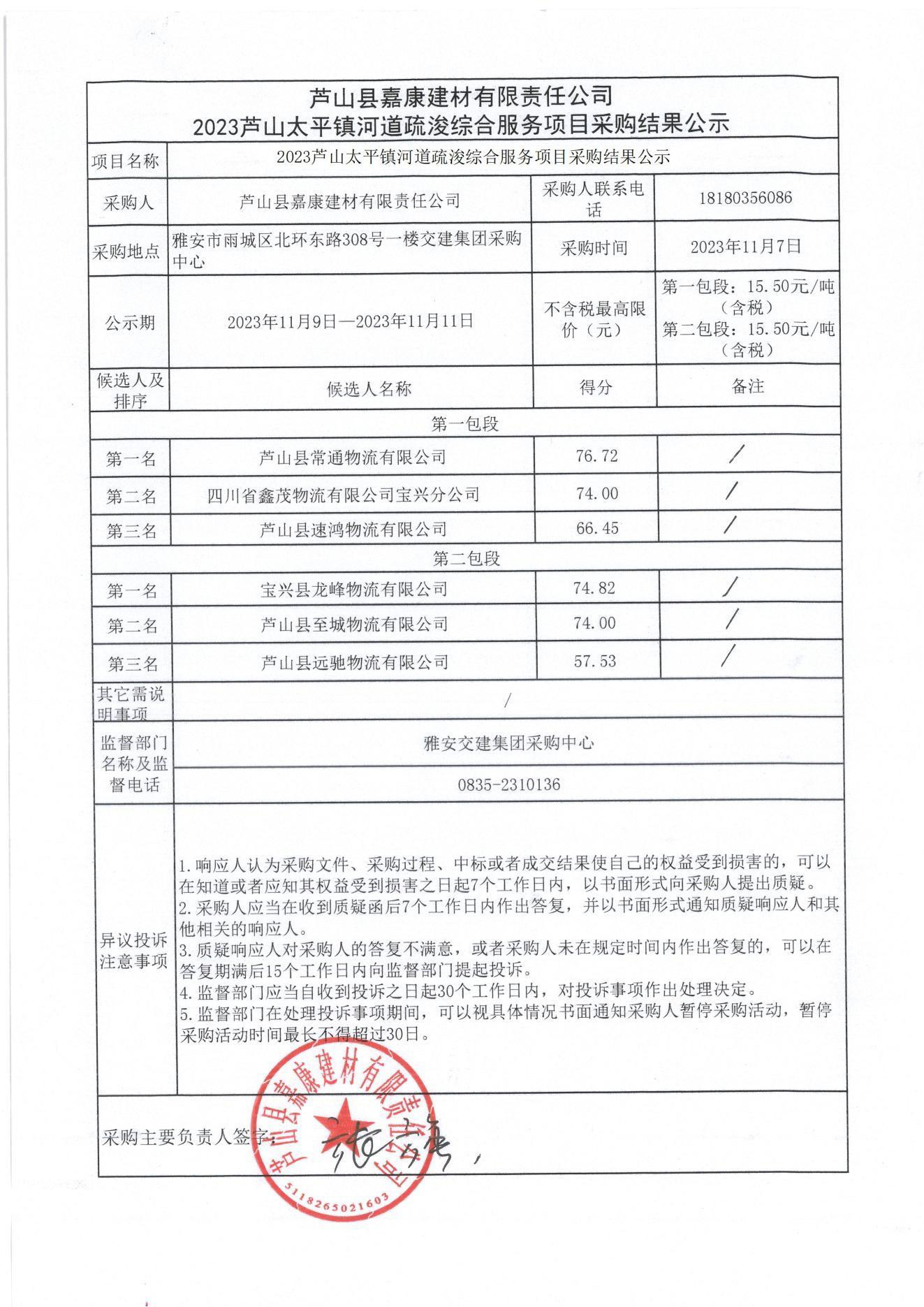 蘆山縣嘉康建材有限責(zé)任公司2023蘆山太平鎮(zhèn)河道疏浚綜合項(xiàng)目采購(gòu)結(jié)果公示