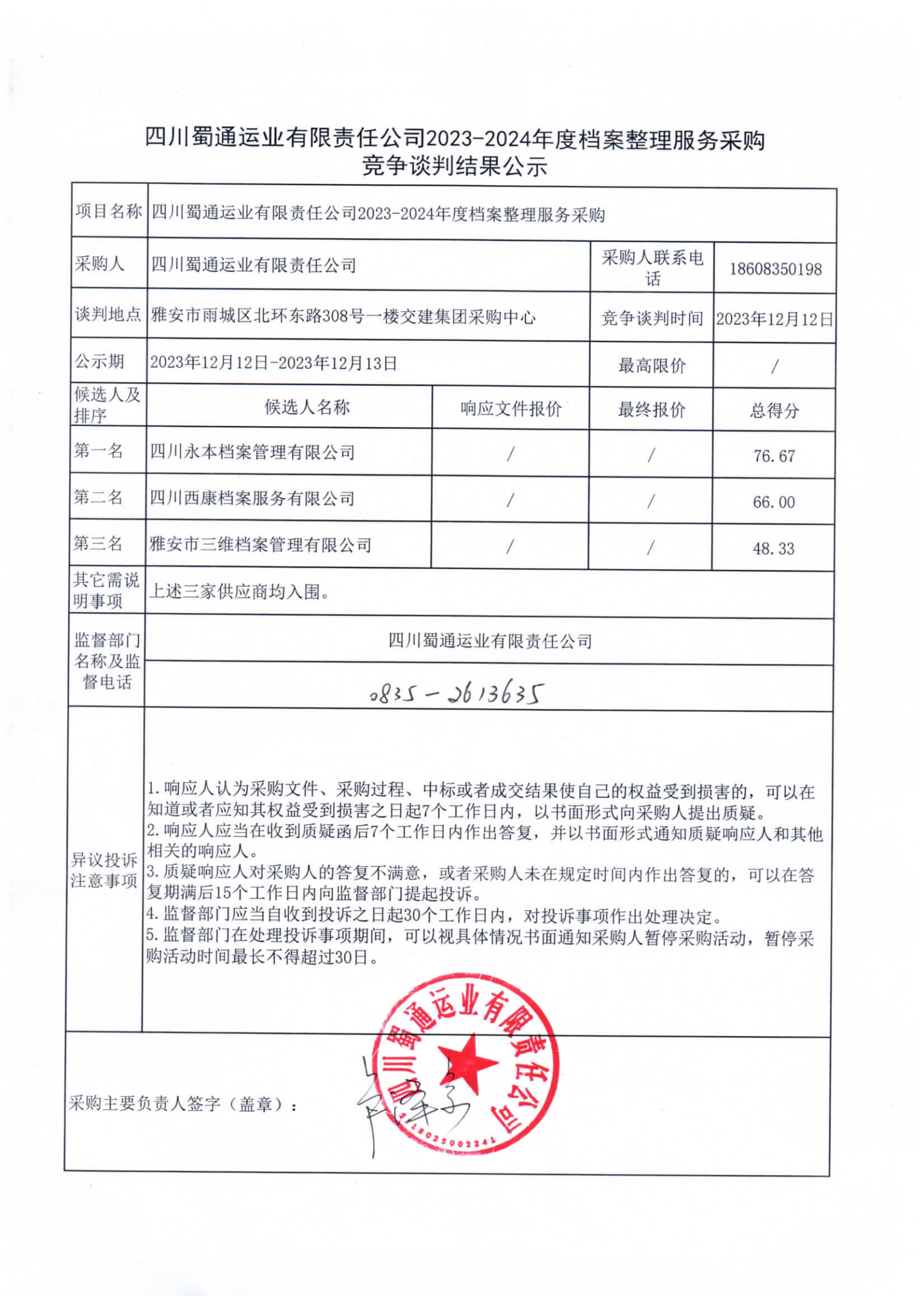 四川蜀通運(yùn)業(yè)有限責(zé)任公司2023-2024年度檔案整理服務(wù)采購(gòu)競(jìng)爭(zhēng)談判結(jié)果公示