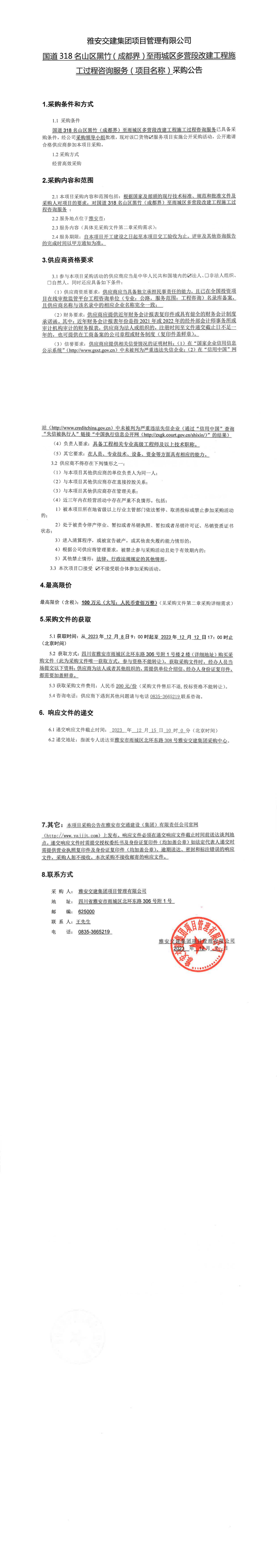 雅安交建集團項目管理有限公司國道318名山區(qū)黑竹(成都界)至雨城區(qū)多營段改建工程施工過程咨詢服務(項目名稱)采購公告