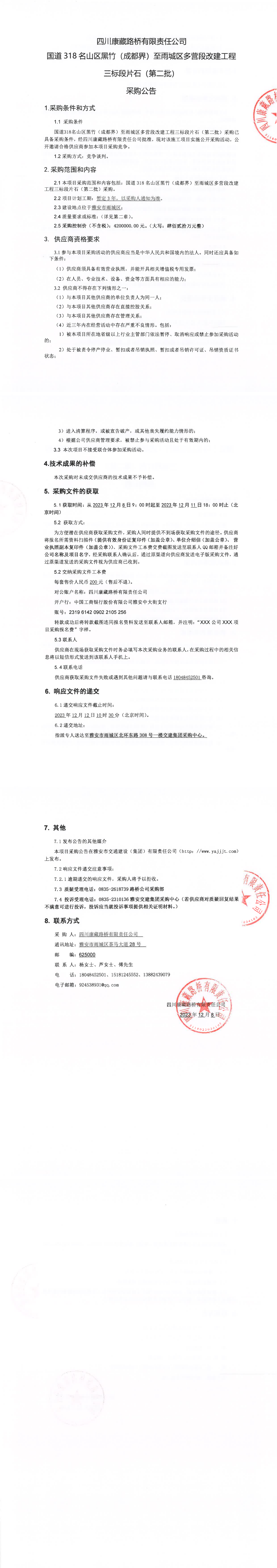 四川康藏路橋有限責(zé)任公司國(guó)道318名山區(qū)黑竹(成都界)至雨城區(qū)多營(yíng)段改建工程三標(biāo)段片石(第二批)采購(gòu)公告