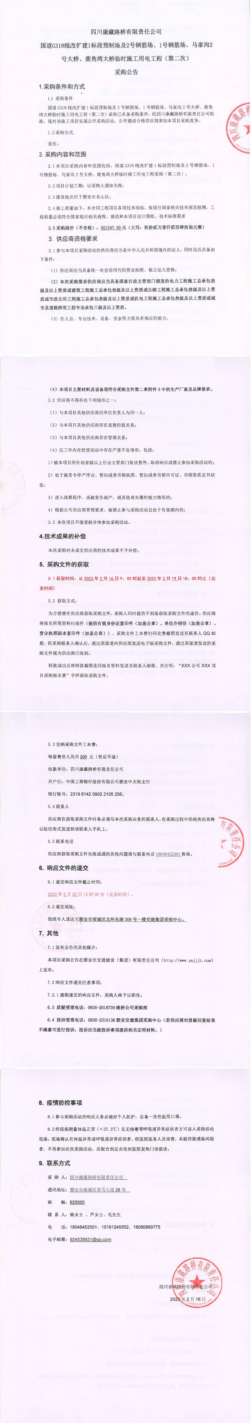 四川康藏路橋有限責任公司國道G318線改擴建1標段預制場及2號鋼筋場、1號鋼筋場、馬家溝2號大橋、鹿角灣大橋臨時施工用電工程(第二次)采購公告