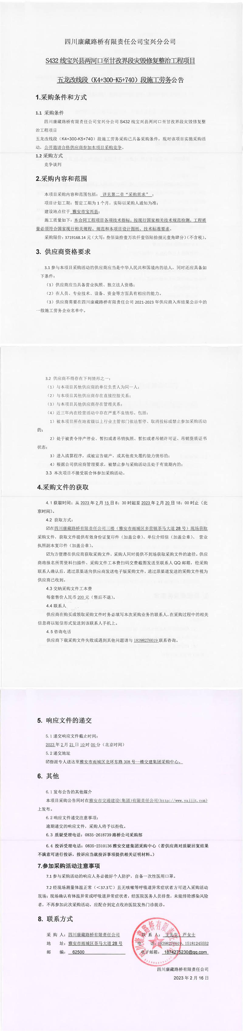 四川康藏路橋有限責(zé)任公司S432線寶興縣兩河口至甘孜界段災(zāi)毀修復(fù)整治工程項(xiàng)目五龍改線段(K4+300-K5+740)段施工勞務(wù)公告