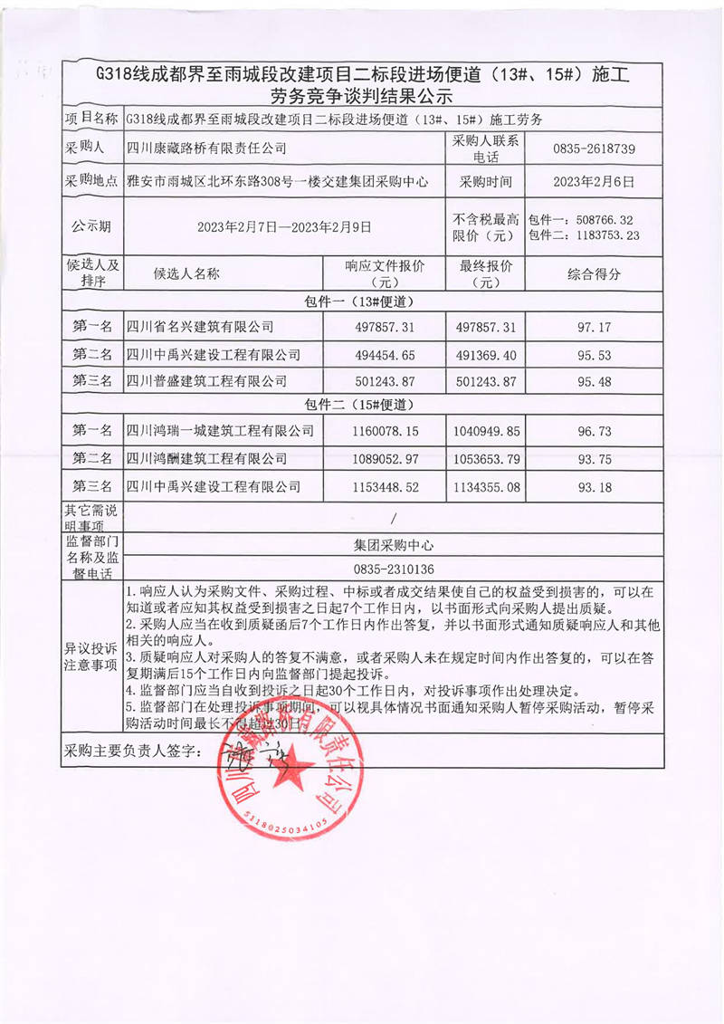 四川康藏路橋有限責任公司G318線成都界至雨城段改建項目二標段進場便道(13#、15#)施工勞務競爭談判結果公示