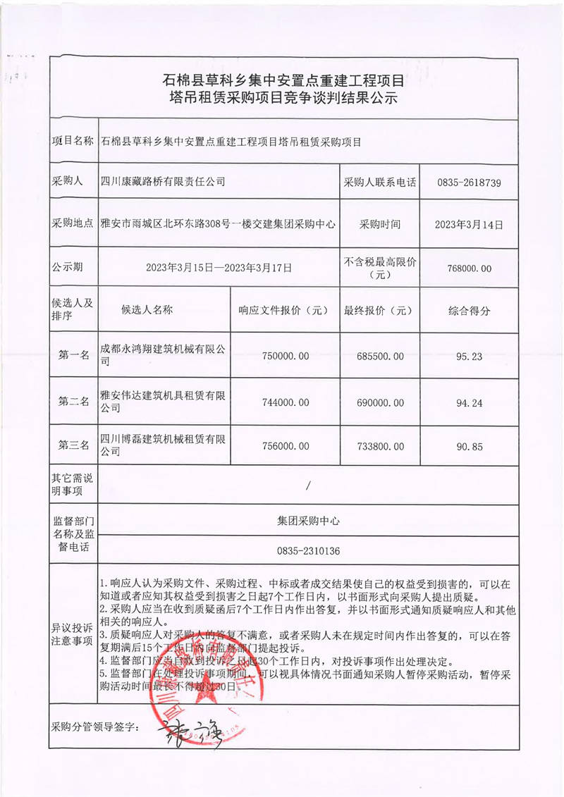 四川康藏路橋有限責(zé)任公司石棉草科鄉(xiāng)集中安置點重建工程項目塔吊租賃采購競爭談判結(jié)果公示