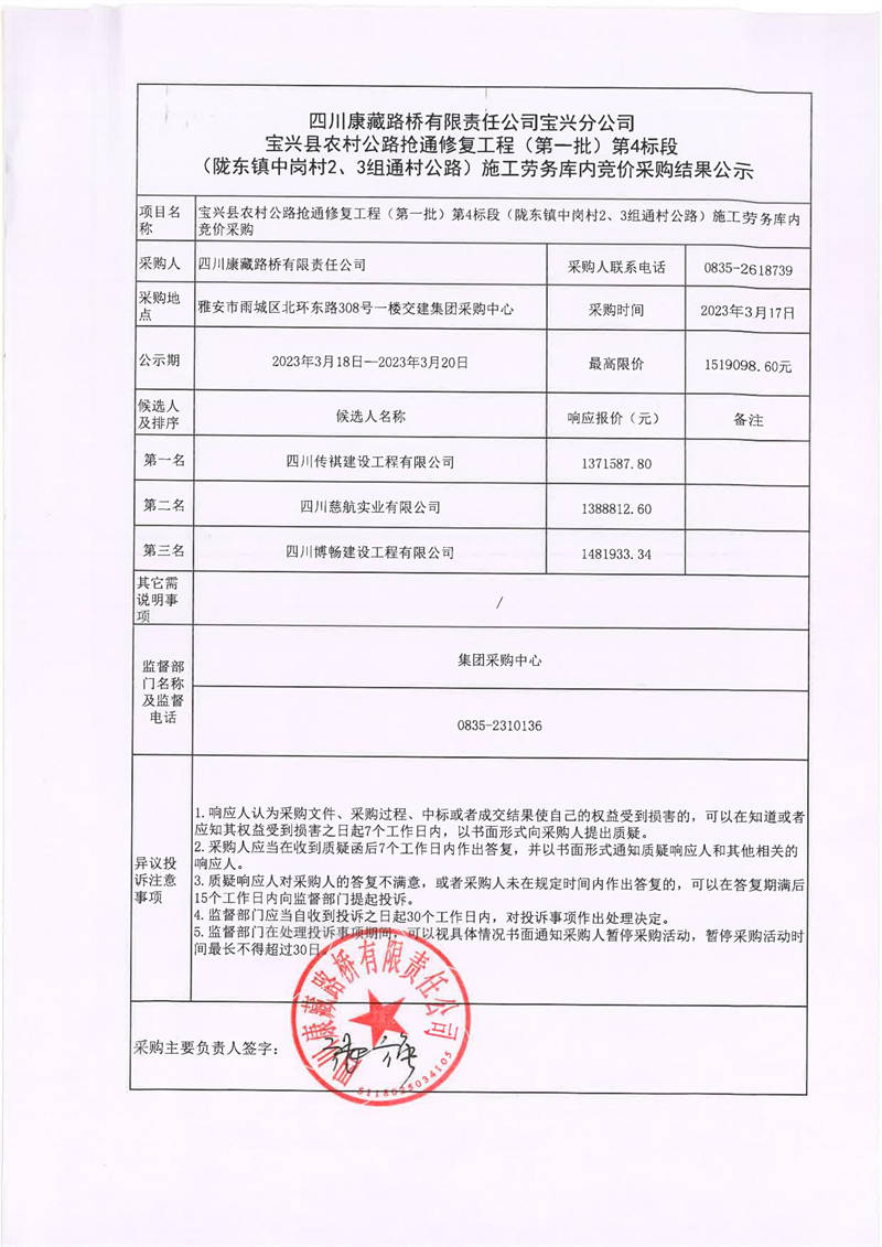 四川康藏路橋有限責(zé)任公司寶興分公司寶興縣農(nóng)村公路搶通修復(fù)工程(第一批)第4標(biāo)段(隴東鎮(zhèn)中崗村2、3組通村公路)施工勞務(wù)庫(kù)內(nèi)競(jìng)價(jià)采購(gòu)結(jié)果公示