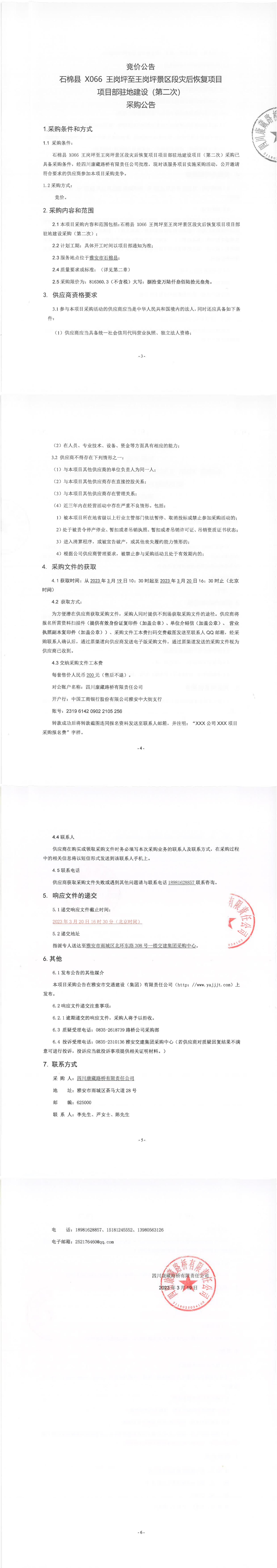 四川康藏路橋有限責(zé)任公司石棉縣X066王崗坪至王崗坪景區(qū)段災(zāi)后恢復(fù)項目項目部駐地建設(shè)(第二次)采購公告