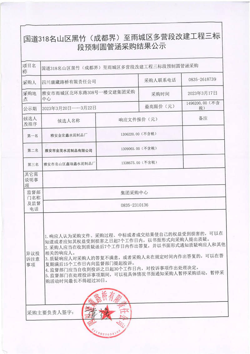 四川康藏路橋有限責任公司國道318名山區(qū)黑竹(成都界)至雨城區(qū)多營段改建工程三標段預(yù)制圓管涵采購結(jié)果公示