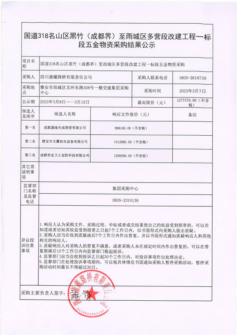 四川康藏路橋有限責(zé)任公司國道318名山區(qū)黑竹(成都界)至雨城區(qū)多營段改建工程一標段五金物資采購結(jié)果公示