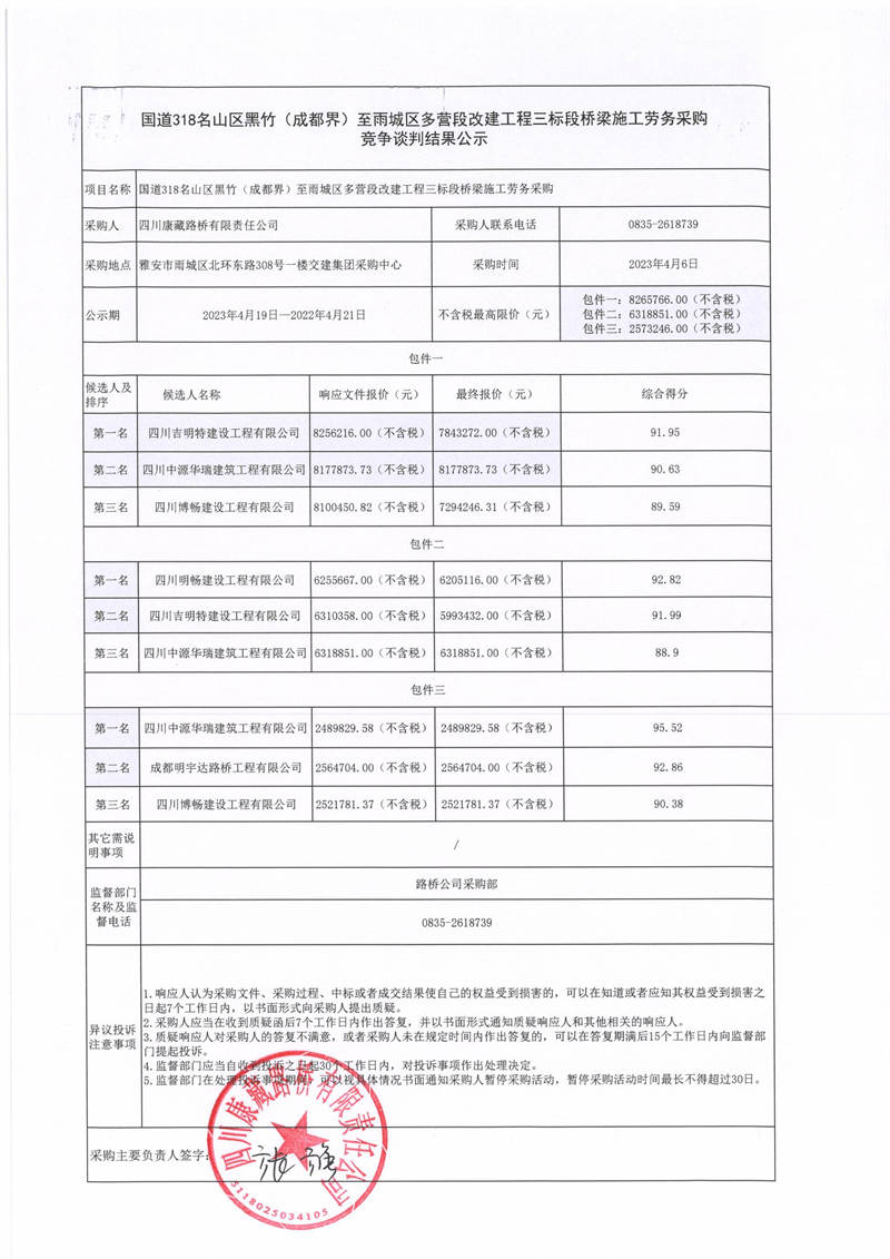 四川康藏路橋有限責(zé)任公司國(guó)道318名山區(qū)黑竹(成都界)至雨城區(qū)多營(yíng)段改建工程三標(biāo)段橋梁施工勞務(wù)采購(gòu)競(jìng)爭(zhēng)談判結(jié)果公示