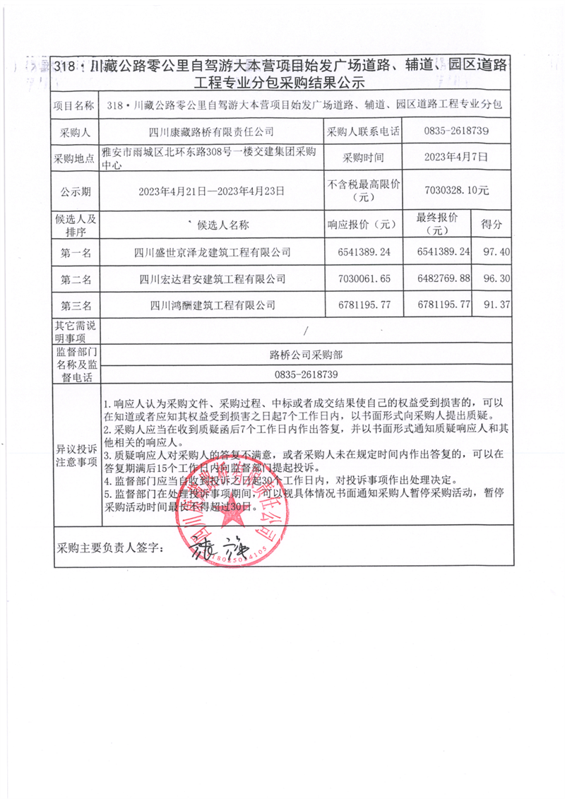 四川康藏路橋有限責(zé)任公司318·川藏公路零公里自駕游大本營(yíng)項(xiàng)目始發(fā)廣場(chǎng)道路、輔道、園區(qū)道路工程專(zhuān)業(yè)分包采購(gòu)結(jié)果公示