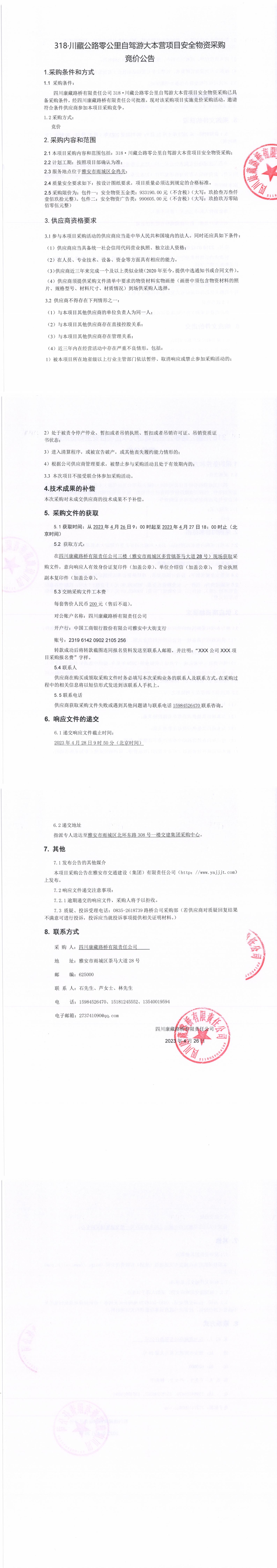 四川康藏路橋有限責任公司318·川藏公路零公里自駕游大本營項目安全物資采購競價公告
